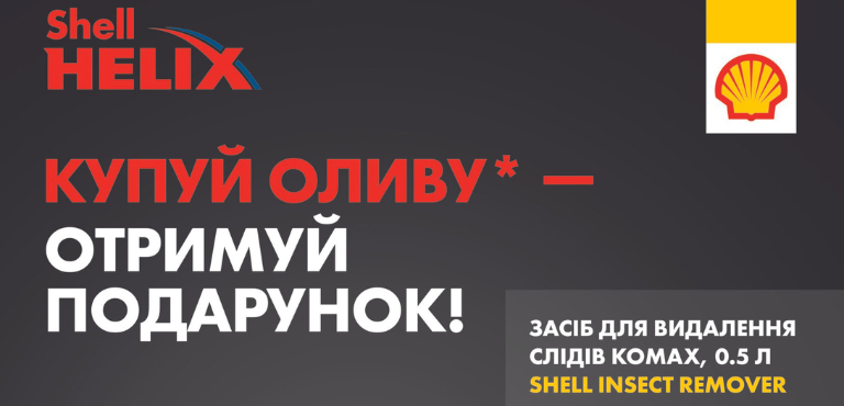 Отримуйте безкоштовно засіб для видалення слідів комах Shell Insect Remover, купуючи моторну оливу Shell Helix. Список акційних товарів: