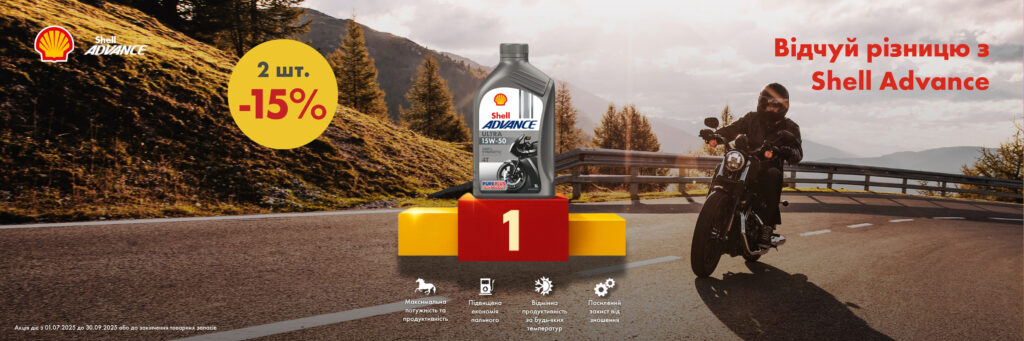 З 01.07.2025 до 30.09.2025 купуйте 2 каністри моторної оливи Shell Advance 1 л зі знижкою -15%!
